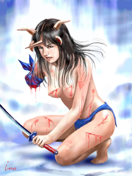 しかし、さすがの鬼娘も多量の出血からか、がっくりと膝をつくのでありました。